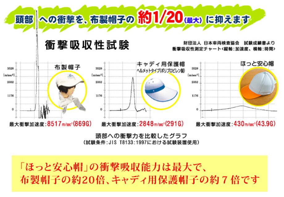布製帽子に比べて最大1/20の衝撃吸収性能で怪我を予防。そしてメッシュ加工によって通気性を確保し熱中症の予防もできる、ダブル予防のキャップ(帽子)です。